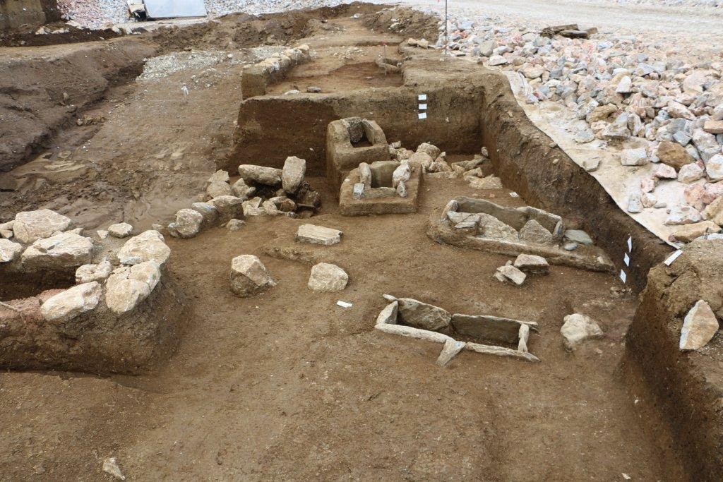 «Η θέση χρησιμοποιήθηκε κατ’ αρχήν ως νεκροταφείο με μέχρι στιγμής δεκαεννέα (19) αποκαλυμμένους κιβωτιόσχημους τάφους (Εικ. 1-3). Αρκετοί περιείχαν πλούσια κτερίσματα, όπως αγγεία (χειροποίητα και τροχήλατα μυκηναϊκού ρυθμού), χάλκινους κρίκους, οστέινες χάντρες, πήλινα «σφονδύλια» ή βαρύδια, χάλκινα μαχαίρια, έναν σφραγιδόλιθο κ.α. (Εικ. 4-5). Κάποιοι από τους τάφους είχαν ιδιαίτερα μικρό μέγεθος και προφανώς περιείχαν παιδικούς ενταφιασμούς (Εικ. 6).